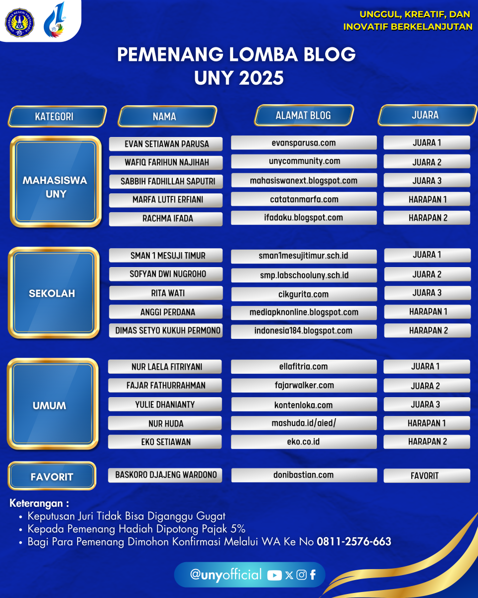 Lomba Blog UNY diadakan dalam rangka memeriahkan Dies Natalis ke-61 Universitas Negeri Yogyakarta.